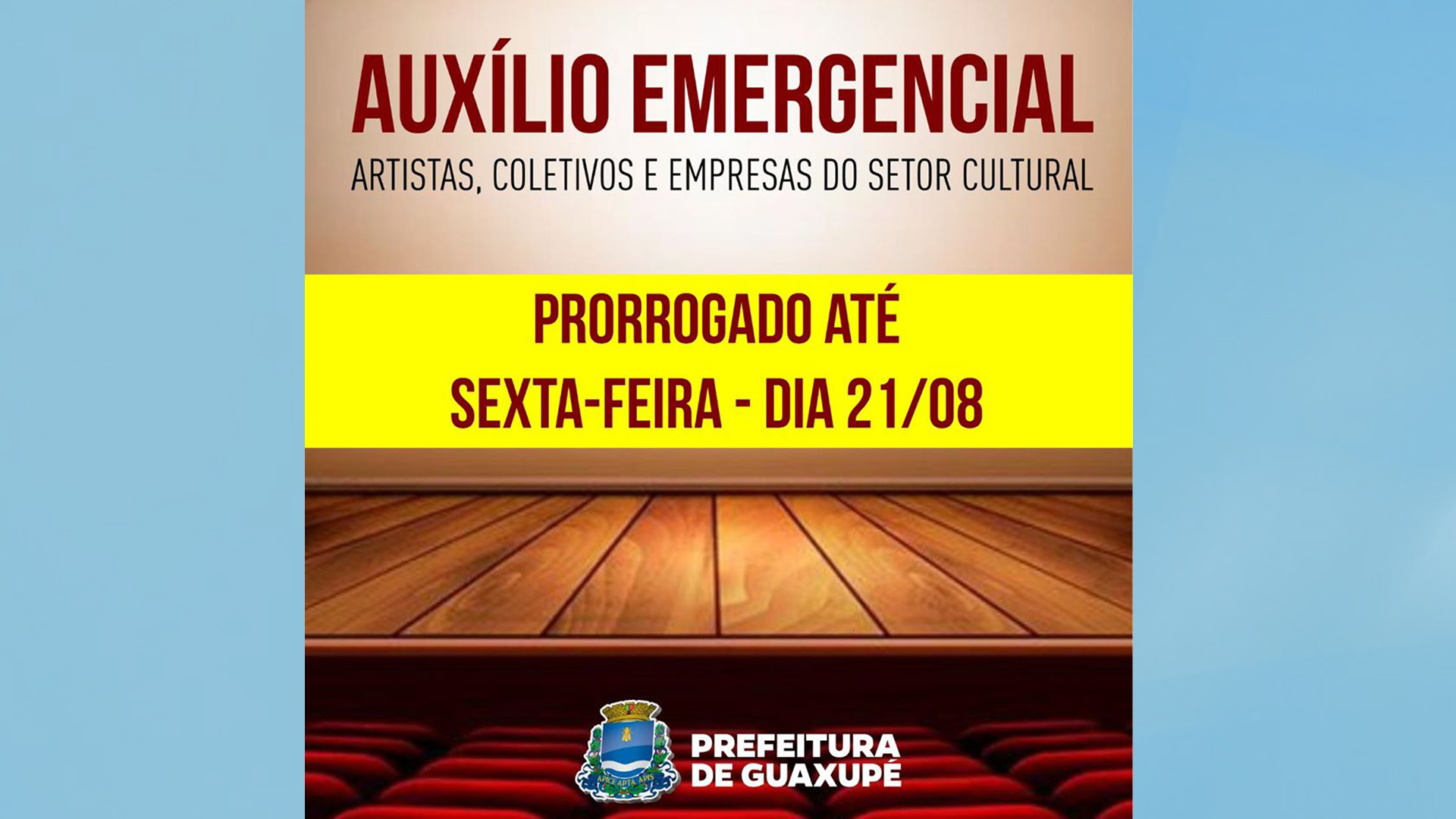 O cadastro para o auxílio emergencial, destinado para artistas, coletivos e empresas do setor cultural foi prorrogado até sexta-feira 21 de agosto. Para fazer o cadastro os interessados devem acessar: www.guaxupe.mg.gov.br/auxiliocultura.