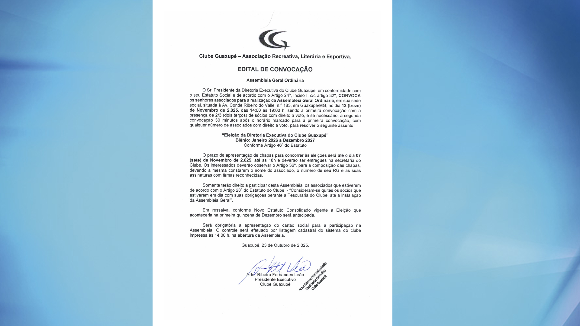 Clube Guaxupé convoca associados para a Assembleia Geral Ordinária