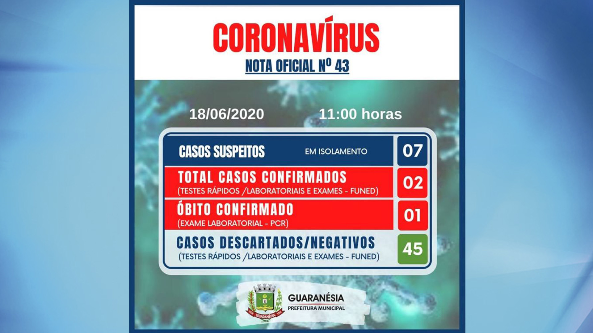 Em coletiva online a prefeitura de Guaranésia confirmou na manhã desta quinta-feira (18), a morte de um homem de 51 anos que deu entrada ao hospital no último dia 8 com sintomas de Covid-19. A morte aconteceu na segunda-feira (15), mas o resultado do exame chegou nesta quinta e confirmou a morte causada pelo novo Coronavírus. Além da morte, mais um caso da doença foi confirmado, confira mais informações.