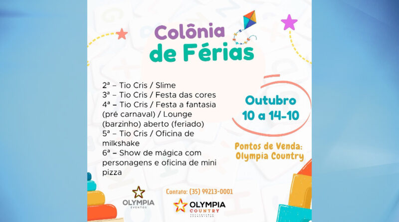 Cidades Olympia Eventos prepara mais uma super “Colônia de Férias” para crianças de Guaxupé e região 28 de Setembro de 202230 de Setembro de 2022 Produção TV Sul 0 Comments Olympia Eventos prepara mais uma super "Colônia de Férias" para crianças de Guaxupé e região About Post Author Produção TV Sul http://www.tvsul.tv.br See author's posts