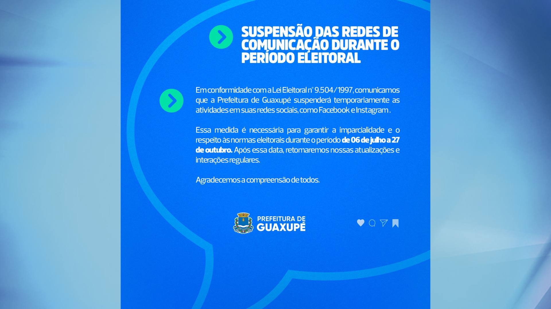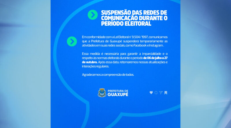 Em Foco Prefeitura de Guaxupé comunica a suspensão das redes sociais durante o período eleitoral 3 de Julho de 20244 de Julho de 2024 Produção TV Sul 0 Comments Prefeitura de Guaxupé suspende suas redes sociais About Post Author Produção TV Sul http://www.tvsul.tv.br See author's posts