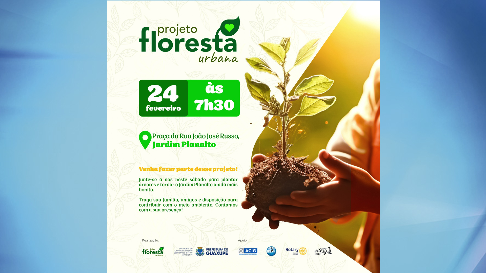 Cidades Comportamento Projeto Floresta Urbana será neste sábado (24) no Jardim Planalto 19 de Fevereiro de 202421 de Fevereiro de 2024 Produção TV Sul 0 Comments Projeto Floresta Urbana será neste sábado (24) no Jardim Planalto About Post Author Produção TV Sul http://www.tvsul.tv.br See author's posts